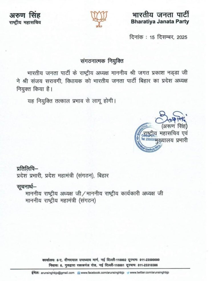 बिहार बीजेपी मेंबड़ा बदलाव हुआ है। संजय सरावगी को भाजपा प्रदेश अध्यक्ष नियुक्त किया गया है। अब बिहार बीजेपी की