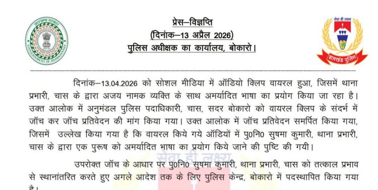 बोकारो (Threesocieties.com Desk): झारखंड के बोकारो जिले में पुलिस महकमे की कार्यशैली एक बार फिर सवालों के घेरे में है। चास थाना प्रभारी सुषमा कुमारी का एक कथित गाली-गलौज वाला ऑडियो सोशल मीडिया पर तेजी से वायरल होने के बाद बोकारो एसपी हरविंदर सिंह ने सख्त कार्रवाई करते हुए उन्हें तत्काल प्रभाव से पद से हटा दिया है। फिलहाल उन्हें पुलिस लाइन में पदस्थापित किया गया है।