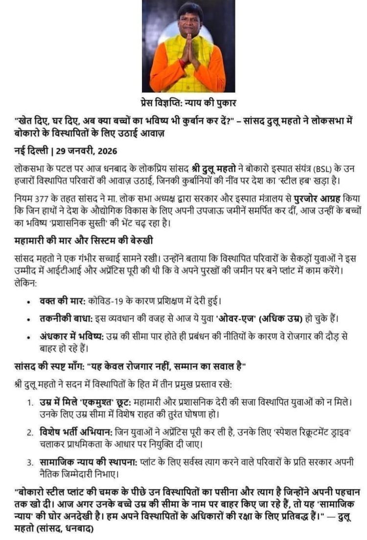 लोकसभा में धनबाद सांसद ढुलू महतो ने बोकारो स्टील प्लांट से जुड़े विस्थापित परिवारों के युवाओं को रोजगार में आयु सीमा से राहत देने और विशेष भर्ती अभियान चलाने की मांग उठाई।