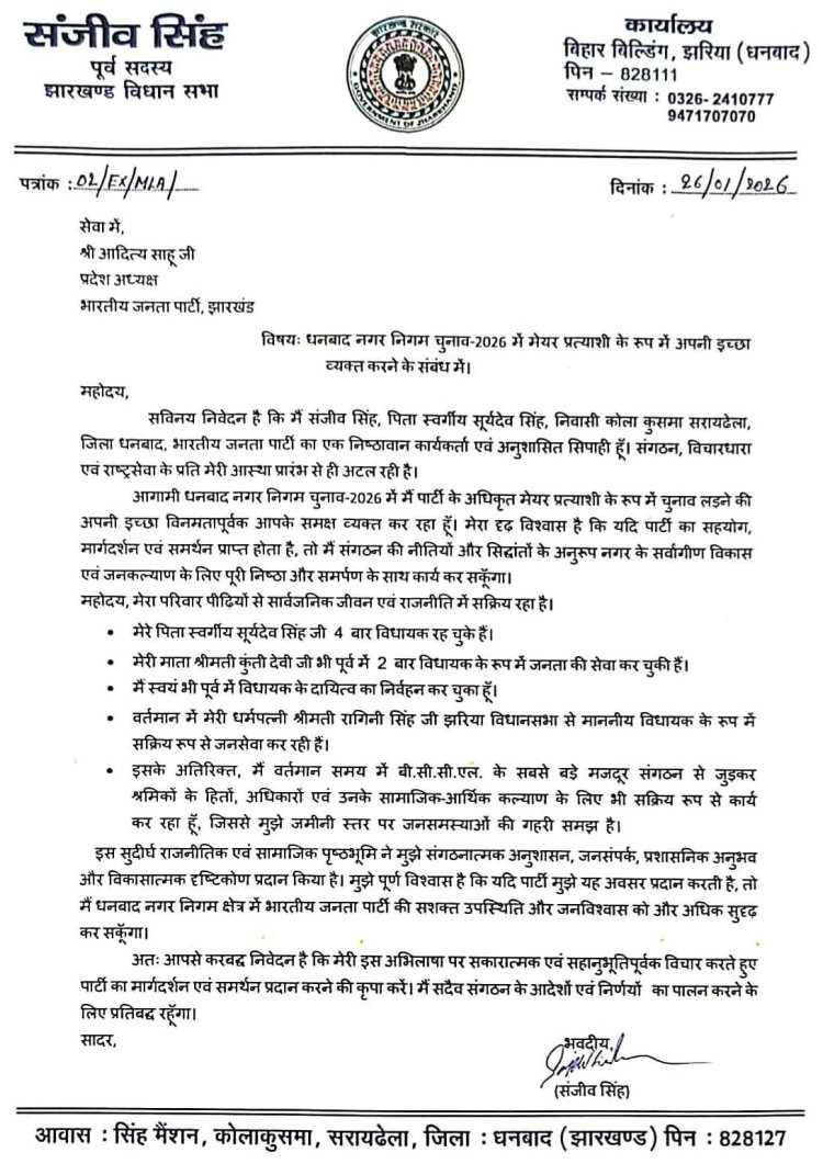 धनबाद( Threesocieties.com Desk)। धनबाद नगर निगम चुनाव 2026 को लेकर कोयलांचल की राजनीति में हलचल तेज हो गई है। झरिया विधानसभा के पूर्व विधायक और कद्दावर नेता संजीव सिंह ने धनबाद के मेयर पद के लिए अपनी दावेदारी ठोक दी है। इस संबंध में उन्होंने भारतीय जनता पार्टी (भाजपा) झारखंड प्रदेश अध्यक्ष आदित्य साहू को औपचारिक पत्र भेजकर चुनाव लड़ने की इच्छा जाहिर की है।
