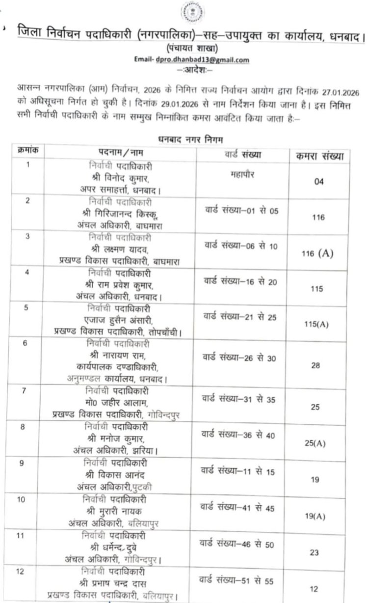 प्रशासन की ओर से धनबाद नगर निगम एवं चिरकुंडा नगर परिषद के सभी वार्डों के लिए निर्वाची पदाधिकारी, नामांकन कक्ष और स्थानों को अधिसूचित कर दिया गया है, ताकि नामांकन कार्य सुव्यवस्थित, पारदर्शी और शांतिपूर्ण तरीके से संपन्न कराया जा सके।