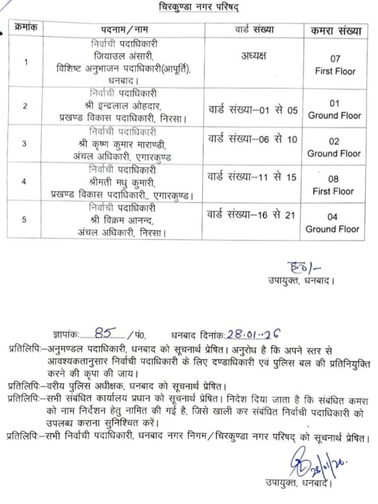 - नगर निगम व चिरकुंडा नगर परिषद के सभी वार्डों के लिए निर्वाची पदाधिकारी व कक्ष अधिसूचित