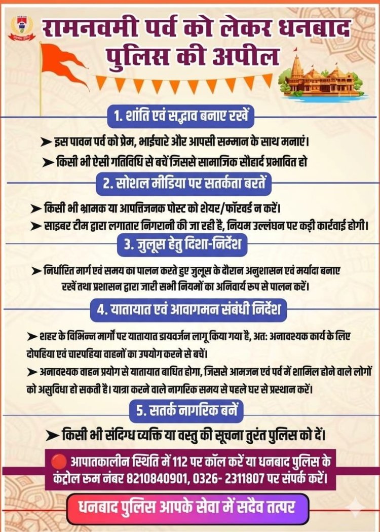 धनबाद (Threesocieties.com Desk): राम नवमी के पावन पर्व को शांतिपूर्ण और सौहार्दपूर्ण माहौल में संपन्न कराने के लिए धनबाद जिला प्रशासन पूरी तरह अलर्ट मोड में आ गया है। इसी कड़ी में गुरुवार को पुलिस कंट्रोल रूम से एक भव्य और प्रभावशाली फ्लैग मार्च निकाला गया, जिसने पूरे शहर में सुरक्षा व्यवस्था का मजबूत संदेश दिया।
