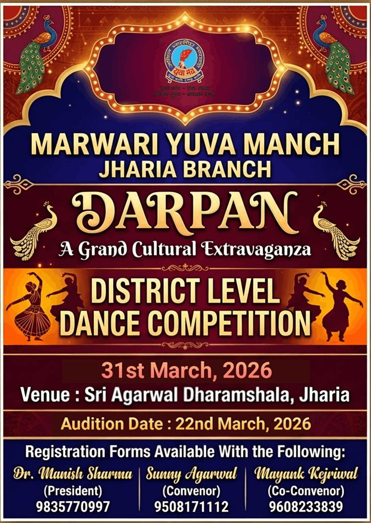 झरिया में मारवाड़ी युवा मंच झरिया शाखा द्वारा ‘दर्पण’ के तहत 31 मार्च 2026 को श्री अग्रवाल धर्मशाला में जिला स्तरीय नृत्य प्रतियोगिता आयोजित होगी। युवाओं को सोलो, ग्रुप डांस व नृत्य नाटिका में प्रतिभा दिखाने का मौका मिलेगा।