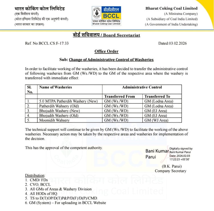 BCCL में बड़ा प्रशासनिक बदलाव, पाथरडीह, भोजुडीह और मुनीडीह सहित 5 वाशरियों का कंट्रोल बदला, अब संबंधित एरिया जीएम संभालेंगे जिम्मेदारी।