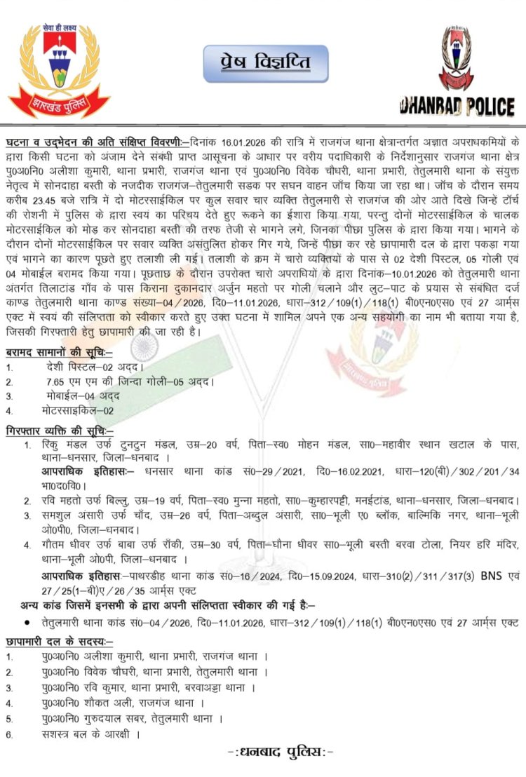 धनबाद में राजगंज-तेतुलमारी रोड पर देर रात पुलिस की घेराबंदी में चार हथियारबंद अपराधी गिरफ्तार। 2 देसी पिस्टल, 5 जिंदा कारतूस, 4 मोबाइल व 2 बाइक बरामद। तिलाटांड़ फायरिंग कांड में संलिप्तता कबूली।