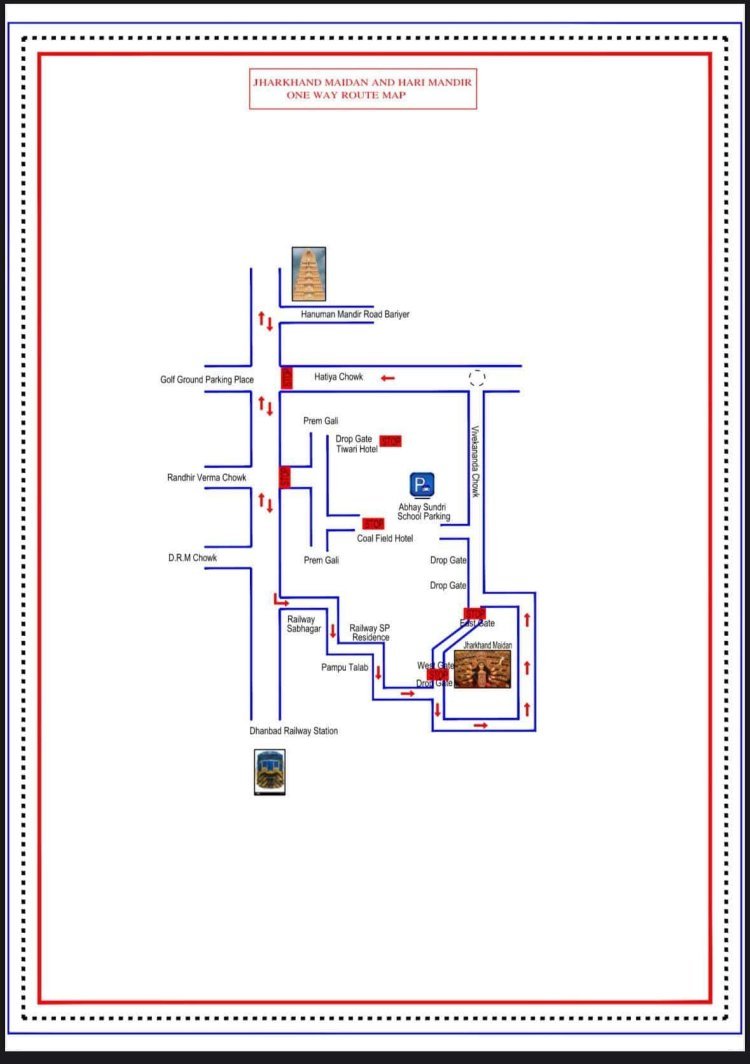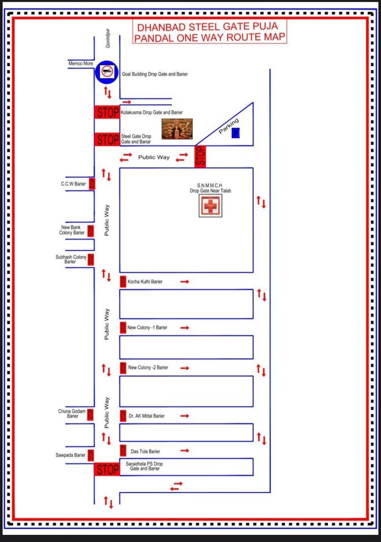 2. धनबाद थाना क्षेत्र - झारखंड मैदान पूजा पंडाल मेंजानेके लिए हटिया मोड़, रणधीर वर्माचौक, डीआरएम चौक, मजार होतेहुए पंपूतालाब सेझारखंड मैदान तक जाएगी एवं वापस आयेगी। धनबाद ब्लॉक, हीरापुर सेभी वापसी का रास्ता रहेगा। वाच एंड वार्ड चौक से झारखंड मैदान पूजा पंडाल की ओर नो-एंट्री रहेगी।