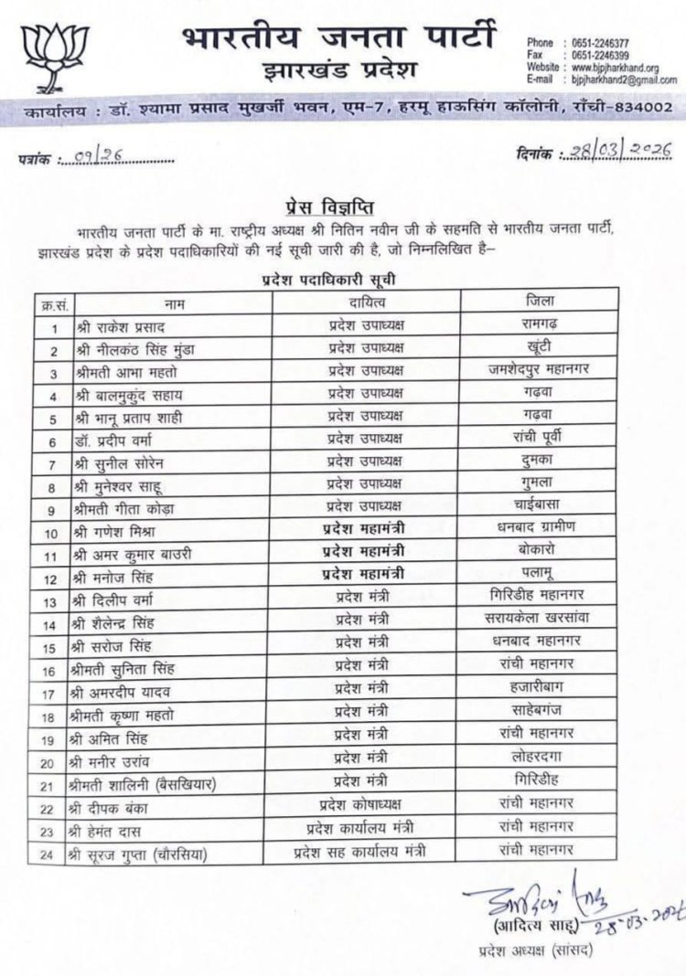प्रदेश पदाधिकारियों की इस 24 सदस्यीय टीम में 9 उपाध्यक्ष, 3 महामंत्री और 9 मंत्री शामिल किए गए हैं। इसके अलावा, कोषाध्यक्ष और कार्यालय मंत्री के पदों पर भी नियुक्तियां हुई हैं। नई टीम में वरिष्ठ नेता नीलकंठ सिंह मुंडा और गीता कोड़ा को प्रदेश उपाध्यक्ष बनाया गया है। राकेश प्रसाद, आभा महतो, बालमुकुंद सहाय, भानु प्रताप शाही, प्रदीप वर्मा, सुनील सोरेन और मुनेश्वर साहू को भी उपाध्यक्ष पद की जिम्मेदारी दी गई है।