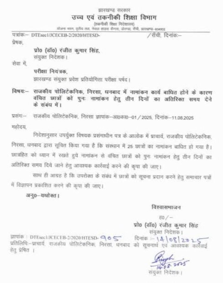 धनबाद। एमपी ढुलू महतो की सख्ती व पहल रंग लाया है। राजकीय पॉलिटेक्निक, निरसा, धनबाद में नामांकन के लिए छात्रौं को अतिरिक्त समय मिल गया है। इस संबंध में झारखंड संयुक्त प्रवेश प्रतियोगिता परीक्षा पर्षद ने पत्र जारी कर दिया है।