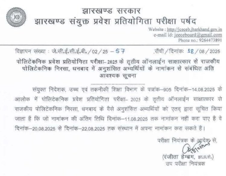 राजकीय पॉलिटेक्निक, निरसा, धनबाद में नामांकन प्रक्रिया बाधित होने के कारण 30 से अधिक छात्रों का भविष्य अधर में लटक गया था। यह गंभीर मामला संज्ञान में आते ही बीजेपी के धनबाद एमपी ढुलू महतो ने बिना देरी किए संबंधित अधिकारियों एवं परीक्षा नियंत्रक के समक्ष इस मुद्दे को कड़े शब्दों में उठाया। एमपी ने स्पष्ट चेतावनी दी कि बच्चों के भविष्य से किसी भी प्रकार का खिलवाड़ किसी भी कीमत पर बर्दाश्त नहीं किया जायेगा। एमपी ढुलू महतो के कड़े रुख और ठोस हस्तक्षेप का नतीजा रहा कि झारखंड संयुक्त प्रवेश प्रतियोगिता परीक्षा पर्षद ने तत्काल कार्रवाई करते हुए नामांकन से वंचित छात्रों को पुनः नामांकन हेतु तीन दिन का अतिरिक्त समय देने का निर्णय लिया। जारी पत्र के अनुसार अभ्यर्थी 20, 21 और 22 अगस्त को नामांकन प्रक्रिया पूरी कर सकेंगे।