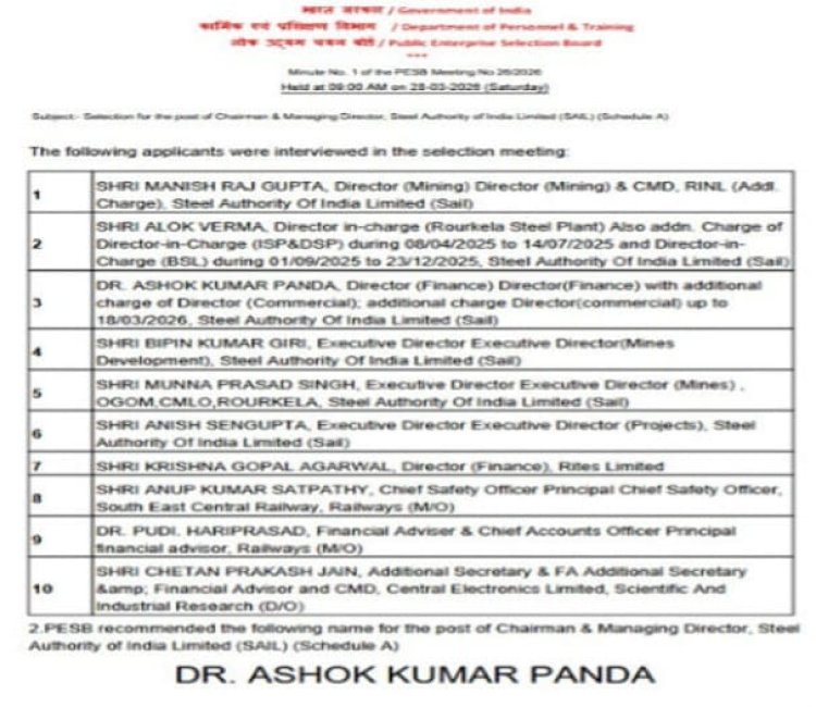 नई दिल्ली (Threesocieties.com Desk ): देश की महारत्न कंपनी Steel Authority of India Limited (SAIL) को नया नेतृत्व मिल गया है। लोक उद्यम चयन समिति (PESB) ने डॉ. अशोक कुमार पंडा को कंपनी का नया प्रबंध निदेशक सह चेयरमैन (CMD) चुना है। उनका कार्यकाल 31 दिसंबर 2029 तक रहेगा, जिससे कंपनी के भविष्य की दिशा तय होने की उम्मीद जताई जा रही है।