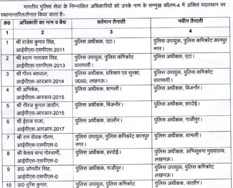 उत्तर प्रदेश: UP में 10 आईपीएस अफसरों का ट्रांसफर, एटा, हरदोई, शामली, जालौन, बिजनौर, गाजीपुर में नये पुलिस कप्तान