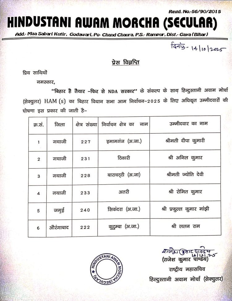पार्टी ने इन सीटों पर प्रत्याशी घोषित कर दिए हैं, जो एनडीए (NDA) में हुए सीट बंटवारे के तहत 'हम' को मिली हैं। सबसे चर्चित नाम है — इमामगंज सीट से मांझी की पुत्रवधू दीपा कुमारी, जिन्हें टिकट मिला है।माना जा रहा है कि मांझी अपने परिवार और संगठन दोनों को चुनावी मैदान में उतारकर पार्टी की पकड़ मजबूत करना चाहते हैं।