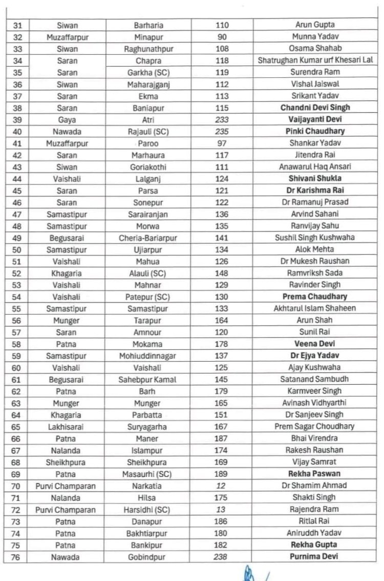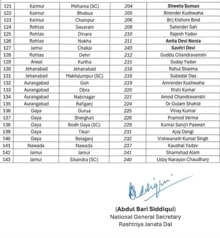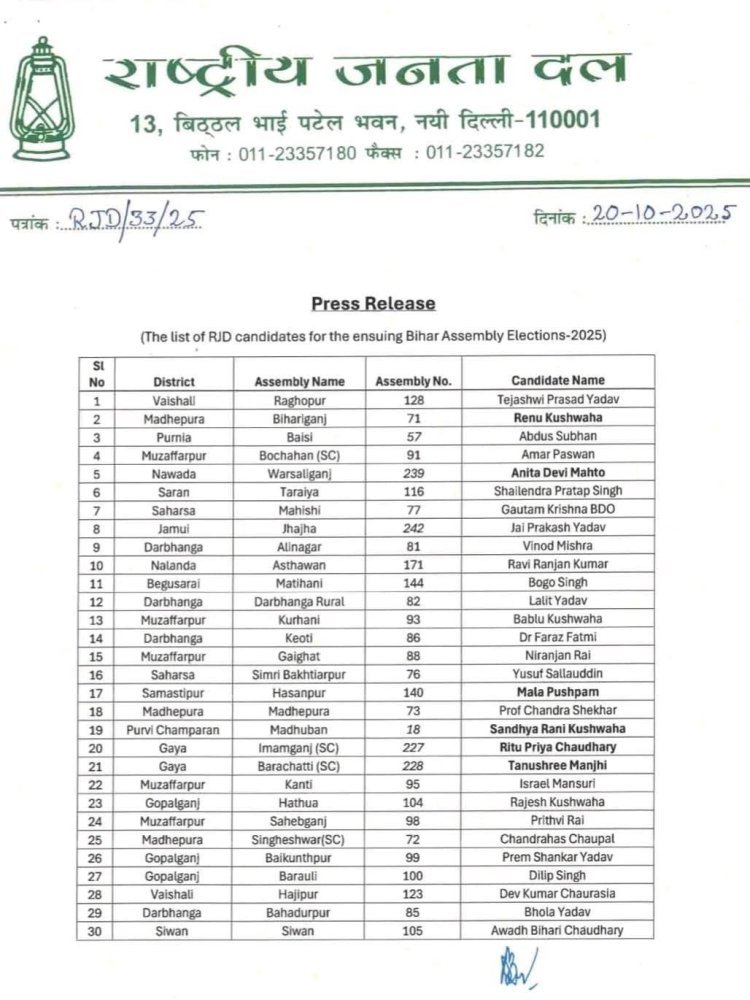 राजद के प्रदेश कार्यालय में आयोजित प्रेस कॉन्फ्रेंस में यह घोषणा की गयी। पार्टी ने कहा कि गठबंधन धर्म का पालन करते हुए 100 सीटें सहयोगी दलों के लिए छोड़ी गई हैं, और उम्मीदवारों के चयन में जातीय व सामाजिक समीकरणों का पूरा ध्यान रखा गया है।सूची में कई पुराने नेताओं को मौका दिया गया है, वहीं कुछ नये चेहरों को भी उतारा गया है। तेजस्वी यादव के अलावा, रेनु कुशवाहा, अमर पासवान, अनीता देवी महतो, डॉ. फराज फातमी, भाई वीरेंद्र, बीमा भारती जैसे नाम प्रमुख हैं।गठबंधन में खटास बढ़ी