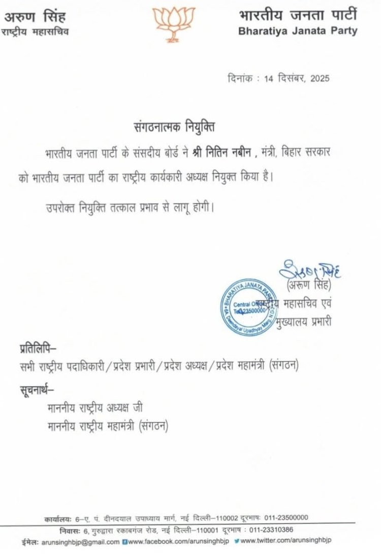 भाजपा के राष्ट्रीय महामंत्री अरुण सिंह ने जानकारी देते हुए बताया कि पार्टी के संसदीय बोर्ड ने नितिन नबीन को राष्ट्रीय कार्यकारी अध्यक्ष नियुक्त किया है। यह निर्णय तत्काल प्रभाव से लागू हो गया है। नितिन नबीन जल्द ही दिल्ली पहुंचकर भाजपा मुख्यालय में औपचारिक रूप से कार्यभार संभालेंगे।