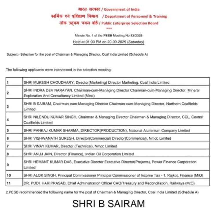 कोल इंडिया चेयरमैन के लिए इंटरव्यू में कुल 11 अफसरों ने हिस्सा लिया। इनमें सीसीएल के सीएमडी निलेंदु कुमार सिंह, कोल इंडिया के डायरेक्टर मार्केटिंग मुकेश चौधरी, एमईसीएल के सीएमडी इंद्रदेव नारायण समेत कई बड़े नाम शामिल थे। वर्तमान चेयरमैन पीएम प्रसाद 31 अक्टूबर 2025 को रिटायर हो रहे हैं। उनके रिटायरमेंट के बाद बी साईराम यह जिम्मेदारी संभालेंगे।