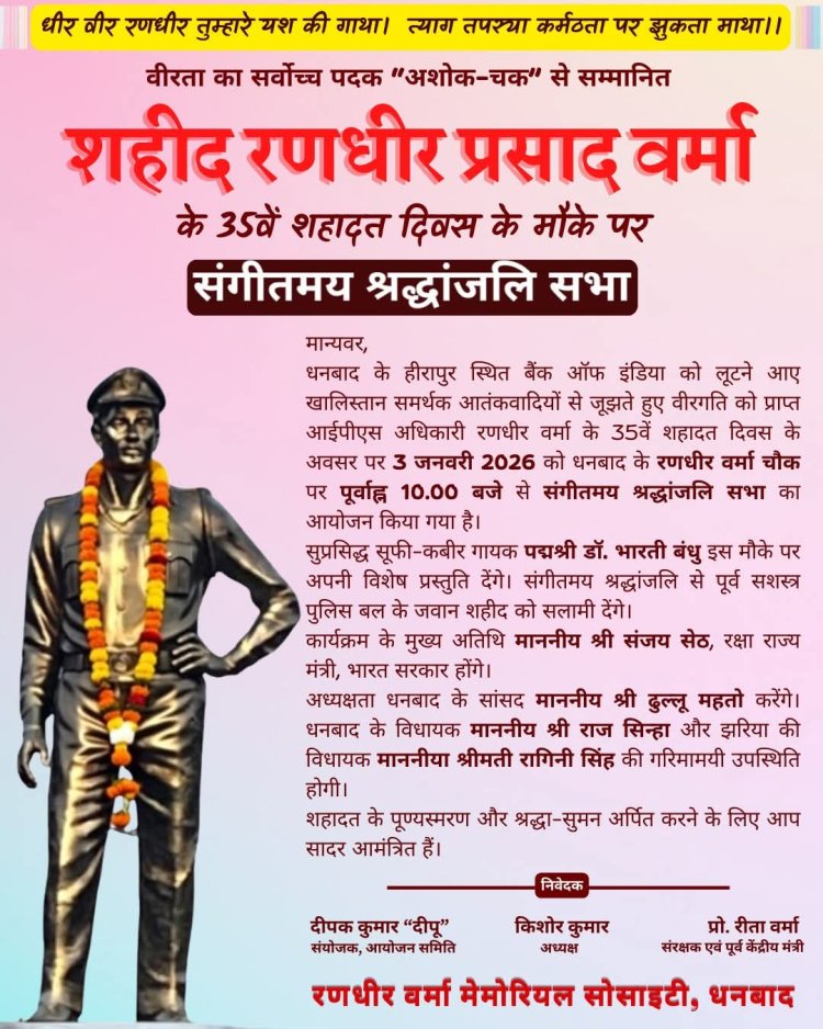 धनबाद में शहीद रणधीर वर्मा के 35वें शहादत दिवस पर 3 जनवरी को संगीतमय श्रद्धांजलि कार्यक्रम का आयोजन होगा। पद्मश्री सूफी गायक डॉ भारती बंधु की प्रस्तुति, केंद्रीय रक्षा राज्य मंत्री संजय सेठ मुख्य अतिथि रहेंगे।