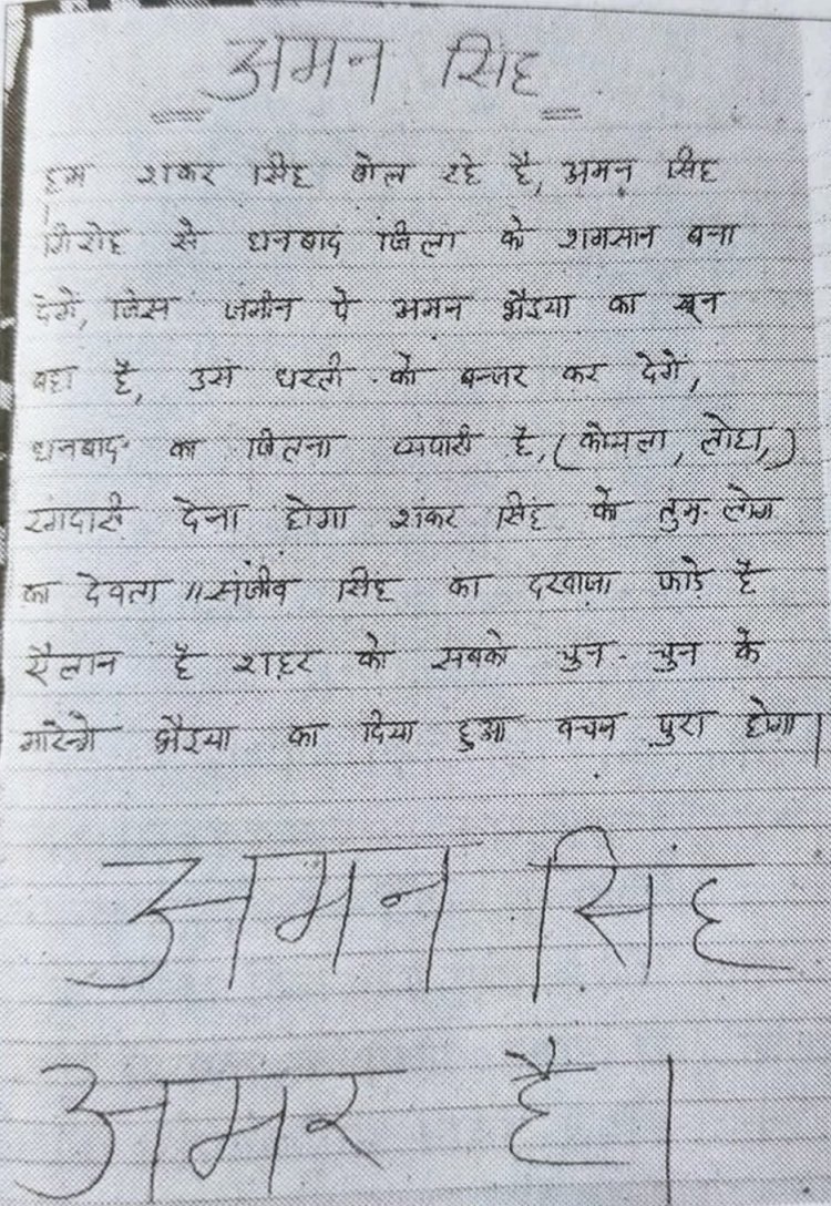हमले के कुछ ही देर बाद सोशल मीडिया पर एक पर्चा वायरल हुआ, जिसमें खुद को गैंगस्टर अमन सिंह गिरोह का सदस्य बताते हुए शंकर सिंह नामक व्यक्ति ने इस बमबारी की जिम्मेदारी ली। पर्चे में धनबाद को “श्मशान” बनाने, व्यापारियों से रंगदारी वसूलने और “चुन-चुन कर मारने” जैसी खौफनाक धमकियां दी गईं। इस वायरल पत्र के बाद एक बार फिर धनबाद के अंडरवर्ल्ड कनेक्शन और पुराने गैंगवार की चर्चाएं तेज हो गईं।