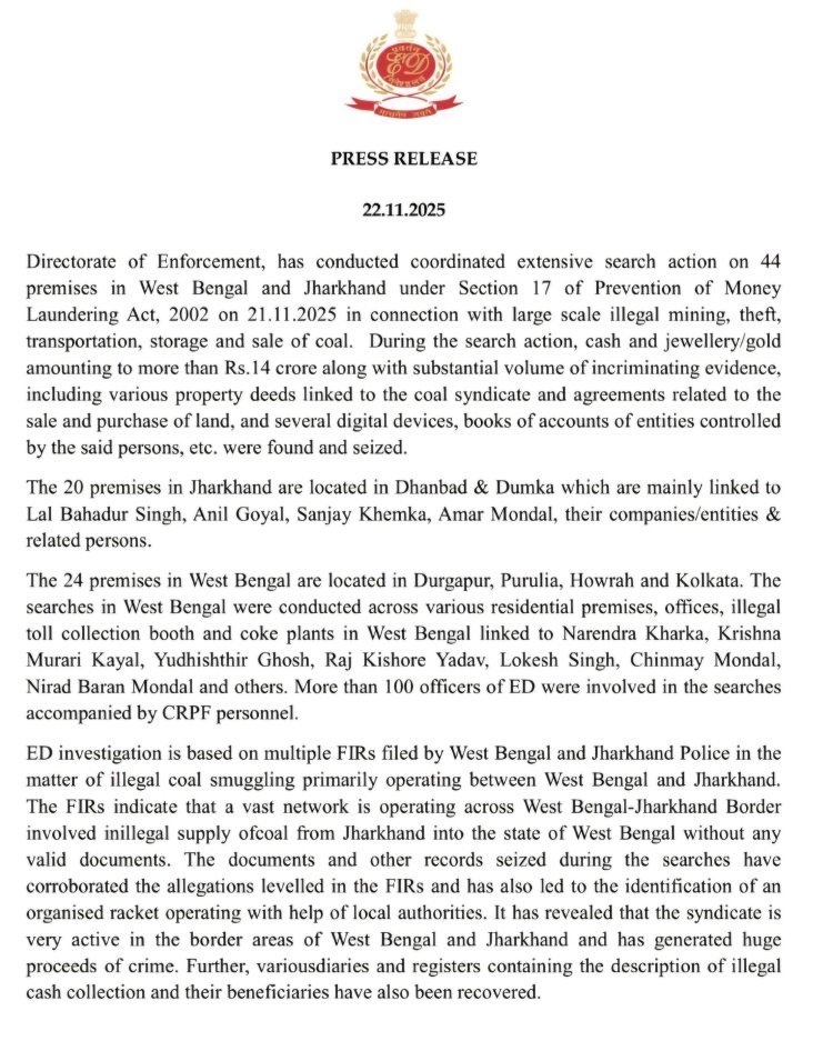 Directorate of Enforcement, has conducted coordinated extensive search action on 44 premises in West Bengal and Jharkhand under Section 17 of Prevention of Money Laundering Act, 2002 on 21.11.2025 in connection with large scale illegal mining, theft, transportation, storage and… pic.twitter.com/szfIPRfhux