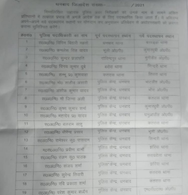2. धनबाद: जिले के 19 ASI का ट्रांसफर, चर्चित कुशवाहा को कतरास से तिसरा भेजा गया