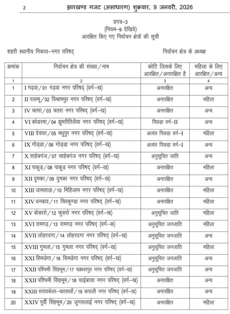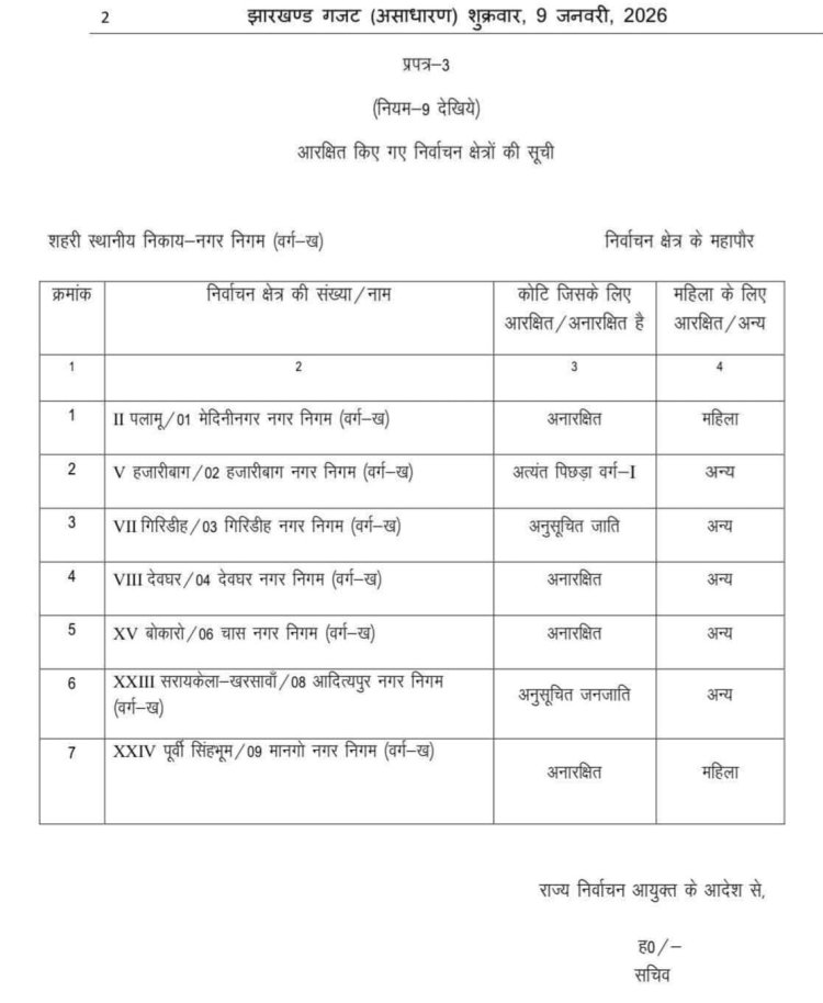 राज्य निर्वाचन आयोग ने यह आरक्षण झारखंड नगरपालिका अधिनियम, 2011 की धारा–27 एवं नगरपालिका निर्वाचन एवं चुनाव याचिका नियमावली, 2012 के नियम–9 के तहत तय किया है। इस संबंध में अधिसूचना 8 जनवरी 2026 को जारी की गई, जिसे 9 जनवरी 2026 को झारखंड गजट में प्रकाशित किया गया।
