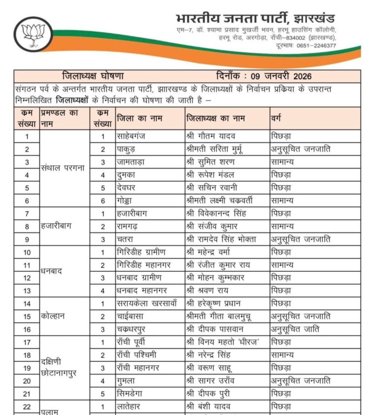 रांची। झारखंड भारतीय जनता पार्टी (भाजपा) ने संगठनात्मक स्तर पर बड़ा फैसला लेते हुए प्रदेश के जिला अध्यक्षों के नामों की घोषणा कर दी है। लंबे समय से प्रतीक्षित इस सूची के जारी होते ही प्रदेश में संगठनात्मक गतिविधियों में नई तेजी आने की उम्मीद जताई जा रही है। पार्टी सूत्रों के अनुसार, यह फैसला केंद्रीय नेतृत्व की मंजूरी के बाद लिया गया है।
