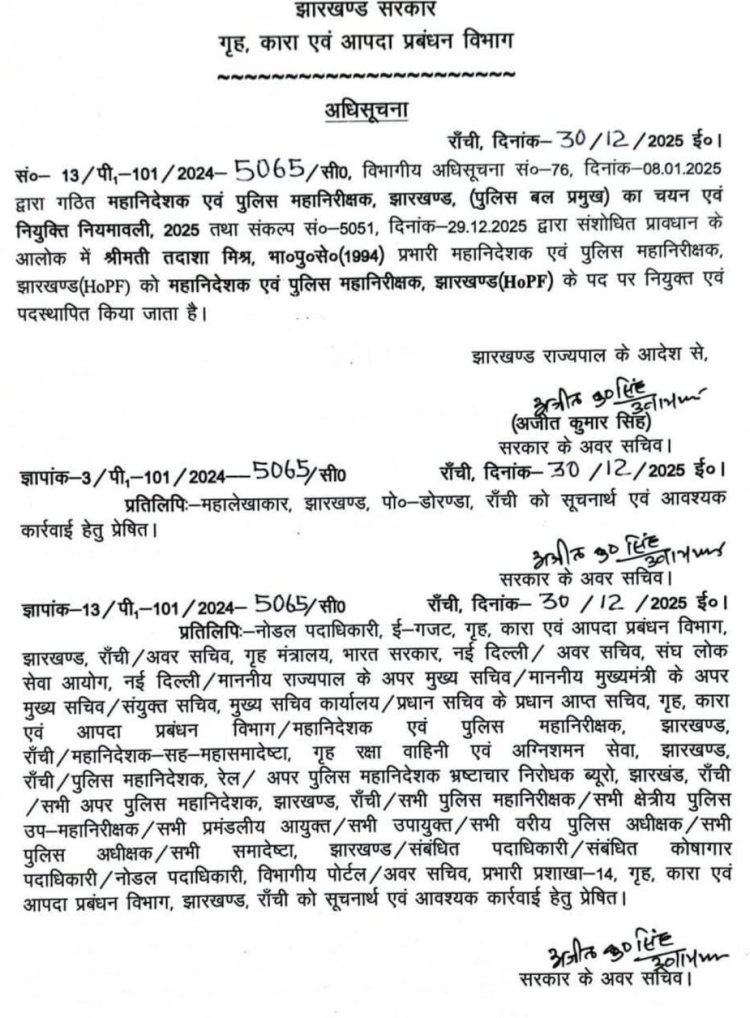जारी अधिसूचना के अनुसार, तदाशा मिश्रा को महानिदेशक एवं पुलिस महानिरीक्षक (HoAF) के पद पर नियुक्त किया गया है। यह नियुक्ति झारखंड में पुलिस प्रमुख के चयन एवं नियुक्ति नियमावली 2025 के संशोधित प्रावधानों के अंतर्गत की गयी है। सरकार ने आठ जनवरी को पुलिस प्रमुख की नियुक्ति को लेकर आदेश जारी किया था, उसी के तहत यह फैसला लिया गया।