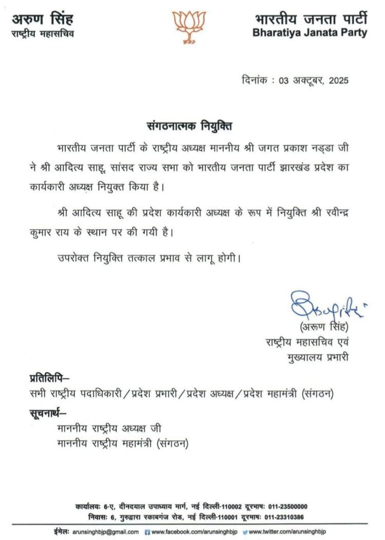 रांची।झारखंड की सियासत में एक बड़ा बदलाव सामने आया है। भारतीय जनता पार्टी (BJP) ने झारखंड में आदित्य साहू को प्रदेश भाजपा का कार्यकारी अध्यक्ष नियुक्त किया है। पार्टी नेतृत्व ने यह फैसला संगठन को नई ऊर्जा और दिशा देने के लिए किया है।