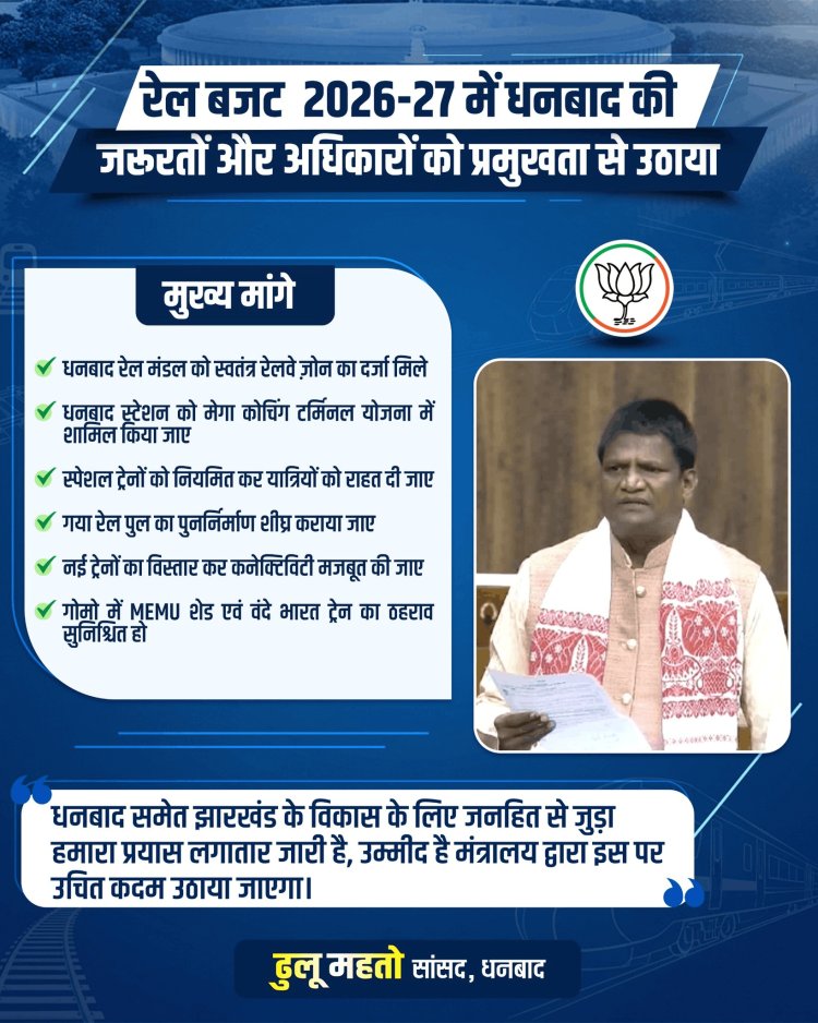लोकसभा में धनबाद सांसद ढुलू महतो ने रेल बजट 2026-27 पर चर्चा के दौरान धनबाद रेल मंडल को रेलवे ज़ोन बनाने, वंदे भारत ट्रेन ठहराव, गोमो में MEMU शेड और बोकारो में SAIL के 18 स्कूल बंद होने का मुद्दा जोरदार तरीके से उठाया।