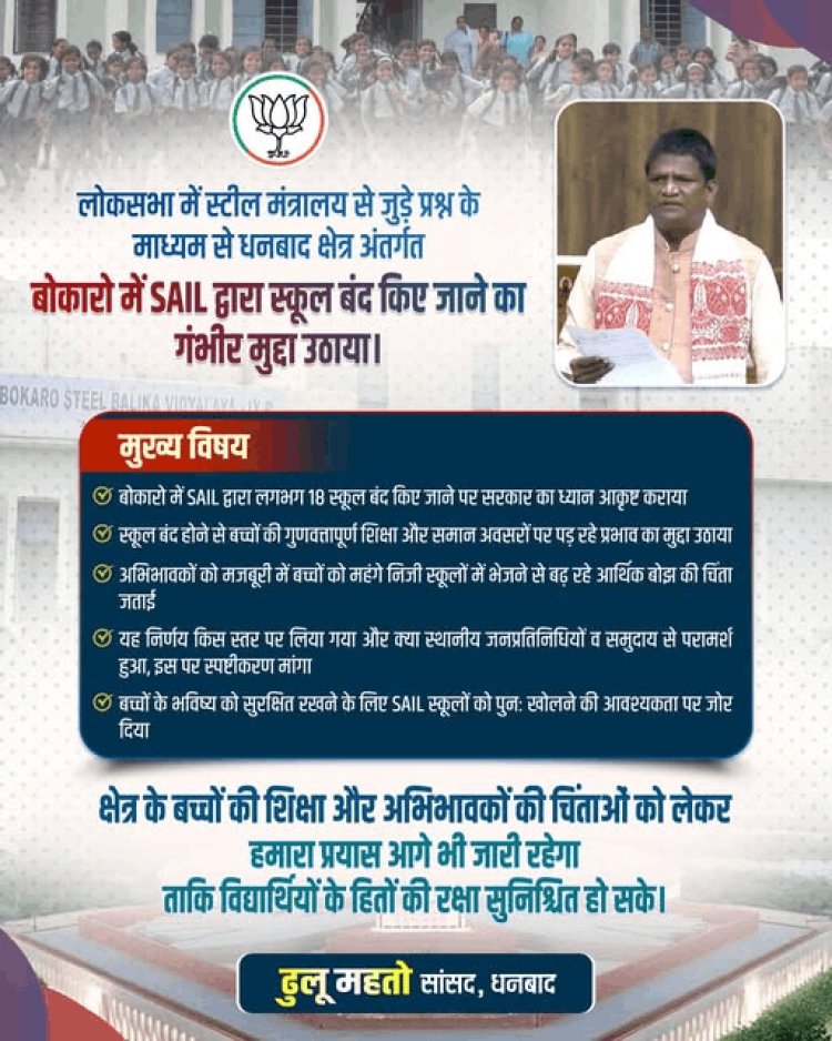रेल से जुड़े मुद्दों के अलावा सांसद ढुलू महतो ने स्टील मंत्रालय से जुड़े प्रश्न के माध्यम से Bokaro में Steel Authority of India Limited द्वारा संचालित स्कूलों को बंद किए जाने का गंभीर विषय भी लोकसभा में उठाया। उन्होंने कहा कि लगभग 18 स्कूलों के बंद होने से हजारों बच्चों की शिक्षा पर सीधा असर पड़ा है। इससे