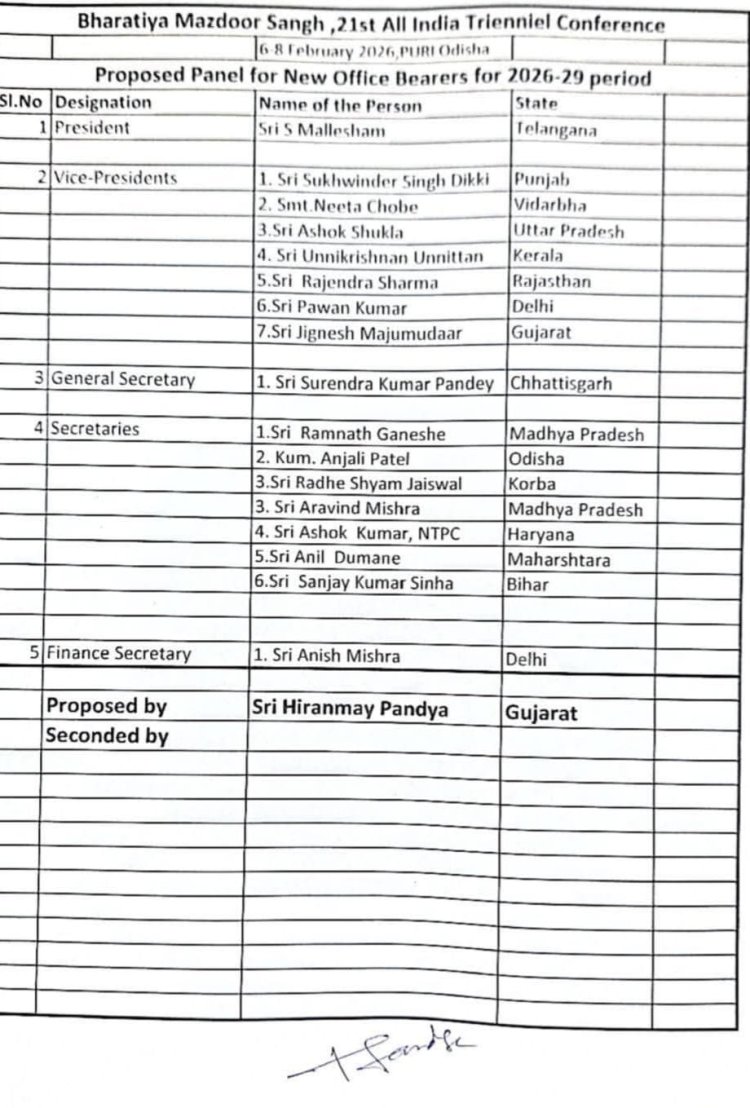 भुवनेश्वर (Threesocieties.com Desk)। भारतीय मजदूर संघ (BMS) के ओडिशा के पुरी में आयोजित 21वें राष्ट्रीय अधिवेशन में वर्ष 2026-2029 के लिए नई राष्ट्रीय कार्यसमिति का गठन किया गया। अधिवेशन में तेलंगाना के एस मलेशम को संगठन का नया राष्ट्रीय अध्यक्ष और सुरेंद्र कुमार पांडेय को महासचिव चुना गया।