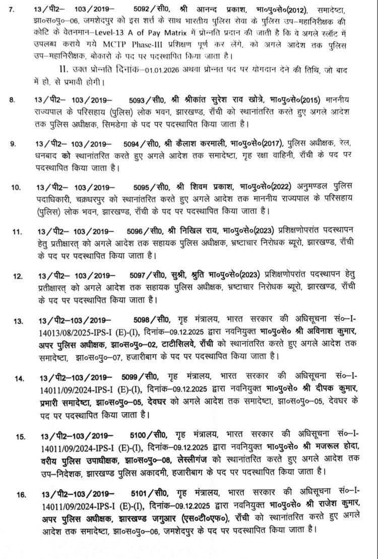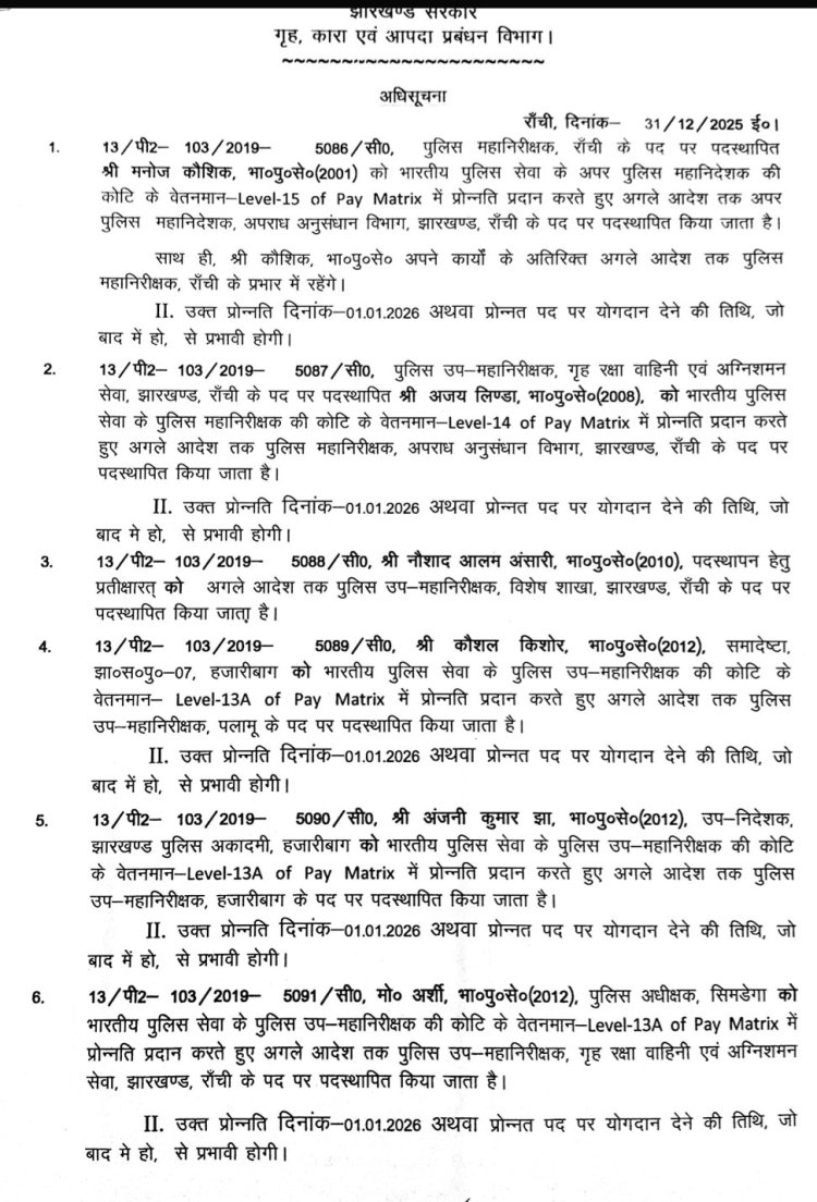 झारखंड पुलिस में बड़ा फेरबदल: छह IPS अफसर प्रमोट, मनोज कौशिक बने CID के ADG, आनंद प्रकाश बोकारो DIG