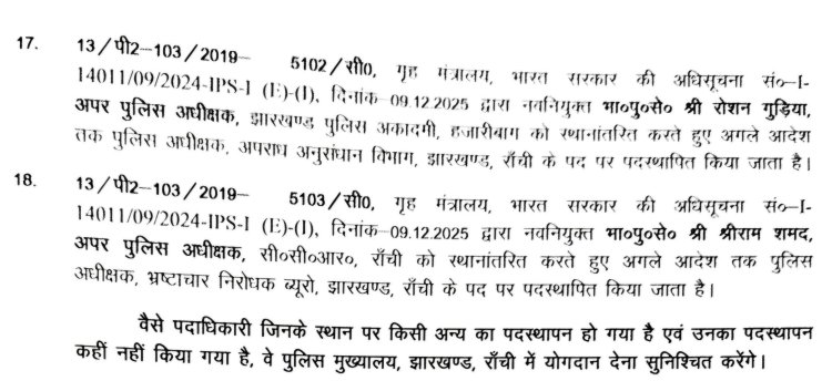 रांची। झारखंड सरकार ने राज्य पुलिस प्रशासन में बड़ा प्रशासनिक बदलाव करते हुए छह आईपीएस अधिकारियों को प्रोन्नति दी है। प्रमोशन पानेवाले अफसरों को महत्वपूर्ण जिम्मेदारियां सौंपी गयी है। इसके साथ ही 12 अन्य आईपीएस अफसरों का भी ट्रांसफर व पोस्टिंग किया गया है। इससे संबंधित अधिसूचना बुधवार देर रात जारी कर दी गयी।