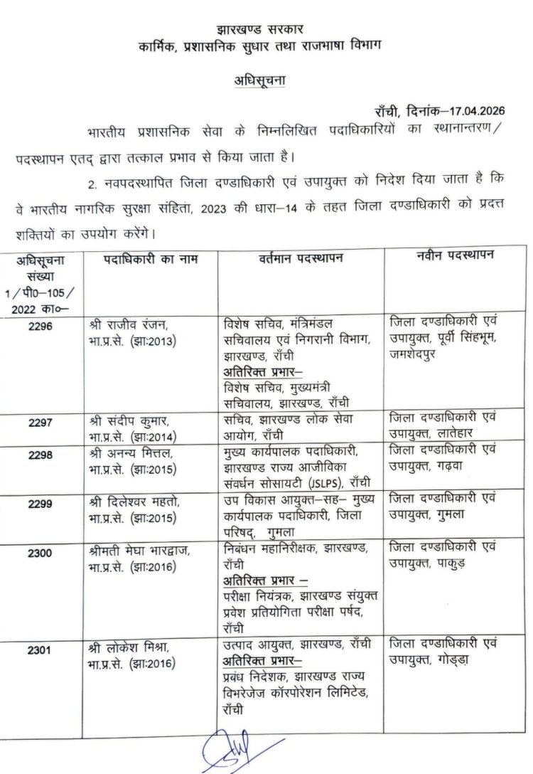 झारखंड में 17 IAS अधिकारियों का बड़ा तबादला, कई जिलों के DC बदले। जानिए किसे कहां मिली नई जिम्मेदारी और क्या हैं इस फैसले के मायने।