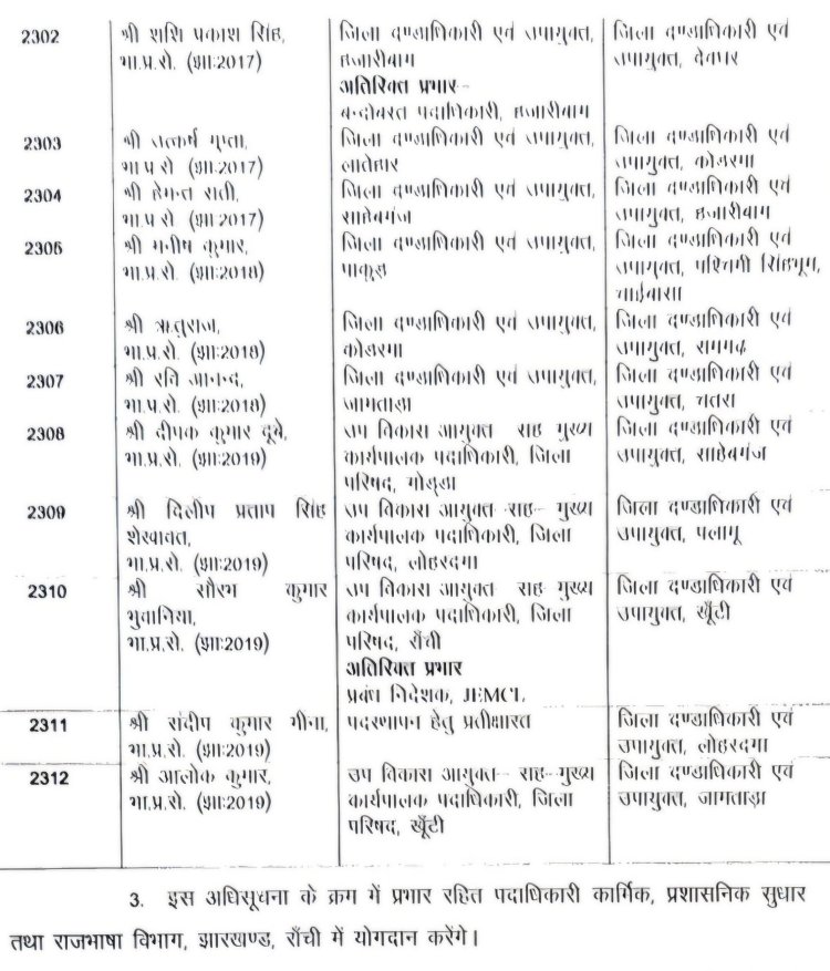 रांची (Threesocieties.com Desk) : झारखंड सरकार ने प्रशासनिक स्तर पर बड़ा और चौंकाने वाला कदम उठाते हुए शुक्रवार देर रात 17 आईएएस अधिकारियों का व्यापक तबादला कर दिया। कार्मिक, प्रशासनिक सुधार तथा राजभाषा विभाग द्वारा जारी अधिसूचना में कई अहम जिलों के उपायुक्त (DC) बदल दिए गए हैं, जिससे प्रशासनिक हलकों में हलचल तेज हो गई है।