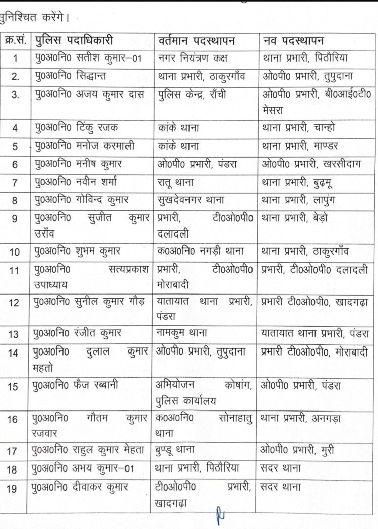 रांची। रांची जिला पुलिस महकमे में बड़ा प्रशासनिक फेरबदल किया गया है। एसएसपी राकेश रंजन ने 17 थानों और ओपी (Out Post) के प्रभारी अधिकारियों का तबादला कर दिया है।